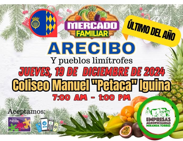 ![]() No te pierdas el Mercado Familiar en Arecibo y pueblos limítrofes, donde podrás disfrutar de productos frescos y locales. |