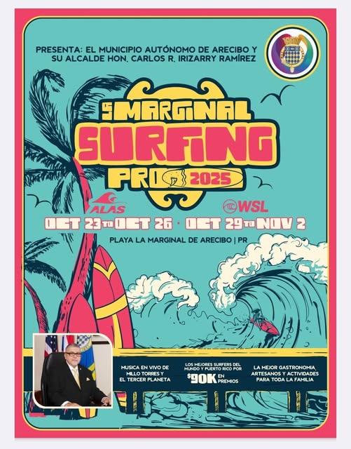 ![]() el Municipio Autónomo de Arecibo y su alcalde Honorable. Carlos R. Irizarry Ramírez presentán el 5to Surf Marginal Pro 2025, |