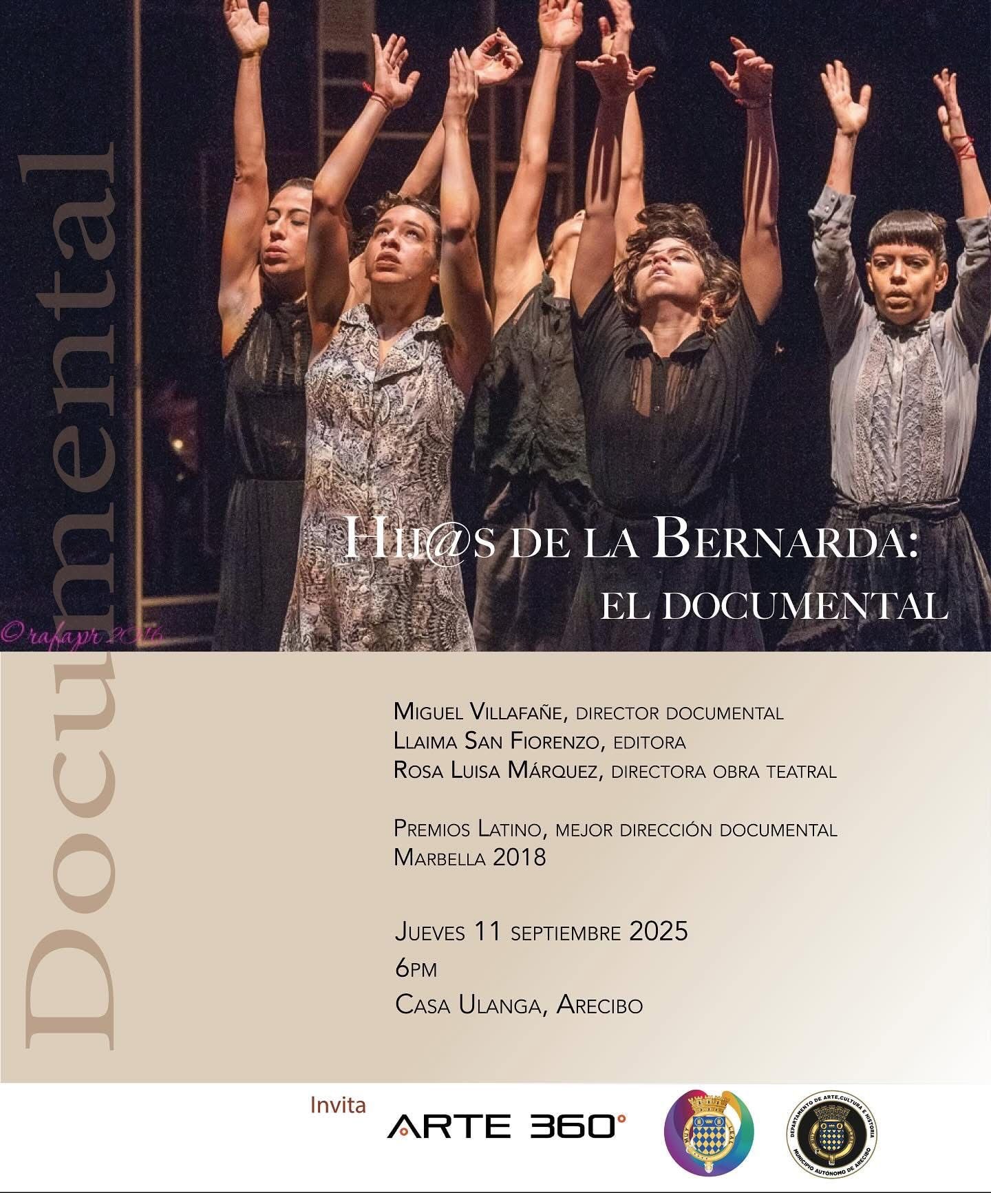 El arte, la danza y el teatro se unen en un evento único. Arte 360 y la Administración Municipal de Arecibo te invitan a la presentación especial del documental “Hijas de la Bernarda”, una producción que muestra el proceso creativo y la fuerza escénica detrás de la aclamada obra teatral dirigida por Rosa Luisa Márquez.