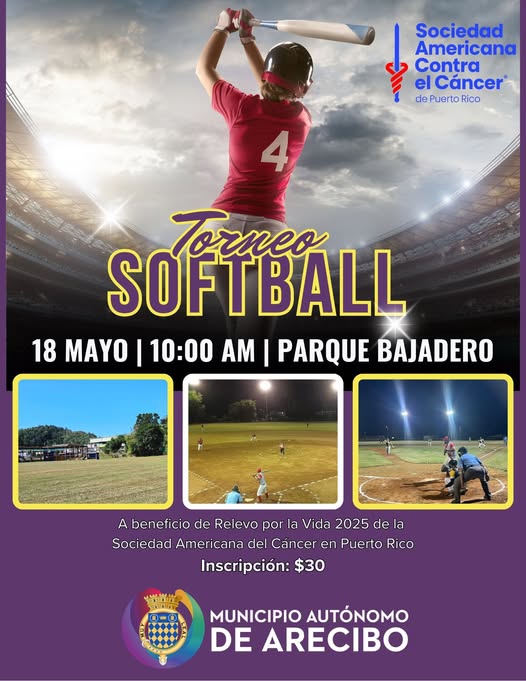 El Municipio Autónomo de Arecibo y la Sociedad Americana Contra el Cáncer de Puerto Rico te invitan a participar en un emocionante Torneo de Softball, con el propósito de recaudar fondos para el evento Relevo por la Vida 2025.