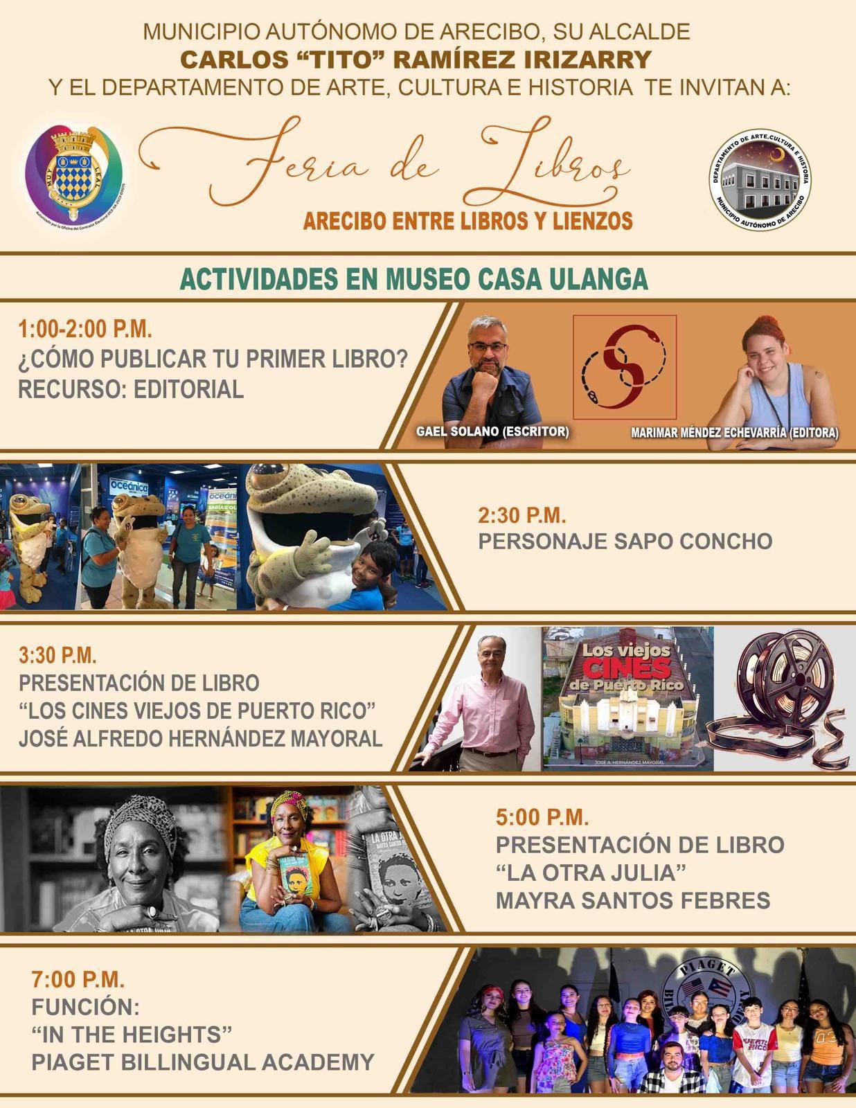 ![]() 🏛️ Museo Casa Trina Padilla de Sanz Actividades durante el día: 🕙 10:00 AM – 11:00 AMTaller para niñosOfrecido por ![]() Actividades destacadas: 🕐 1:00 PM – 2:00 PM¿Cómo publicar tu primer libro?Con el escritor Gael Solano y la editora Marimar ![]() 🎶 Calle Gonzalo Marín – Tarima Principal Itinerario musical del día: 🕤 9:30 AM – 10:00 AMManrique Román 🕑 2:00 ![]() Una celebración del arte, la lectura y la cultura local El Municipio Autónomo de Arecibo y su Departamento de Arte, ![]() Evento especial: Micrófono Abierto entre Libros y Lienzos 🕒 3:00 PM Participación de: Luis Enrique Romero Wilmarie Feliciano Luis A. ![]() El Municipio Autónomo de Arecibo, su alcalde el Hon. Carlos “Tito” Ramírez Irizarry, y el Departamento de Arte, Cultura e |