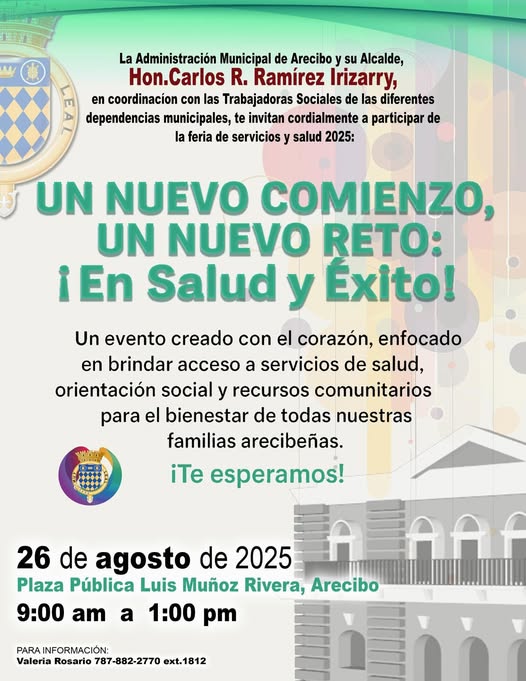 el Municipio Autónomo de Arecibo y su alcalde Carlos R. Ramírez Irizarry, en coordinación con las trabajadoras sociales de sus distintas dependencias, llevarán a cabo la Feria de Servicios y Salud 2025 bajo el lema:
