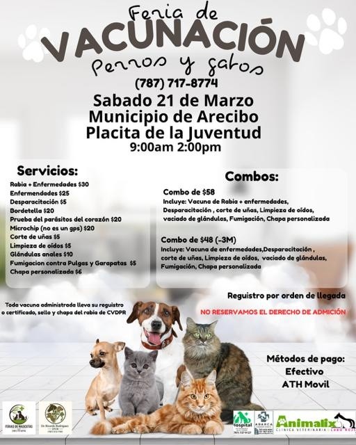 Municipio Autónomo de Arecibo:Separa la fecha”,Sábado 21 de Marzo en la Placita de la Juventud…De 9:00 am a 2:00 pm. “Feria de Vacunación para perros  y gatos “